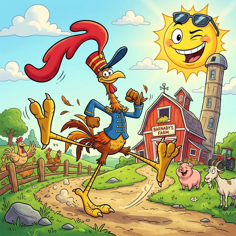 A humorous and exaggerated scene in animation. Show a tall, skinny rooster character with a long, bright red comb and oversized feet. He is performing a theatrical high-step march across a vibrant green, cartoon-style farmyard. In the background, there's a ridiculously oversized red barn and a silo that appears to be taller than it is wide. The sun in the sky has a huge, silly grin, a pair of sunglasses, and is winking at the viewer, adding to the exaggerated and comical vibe of the animation.