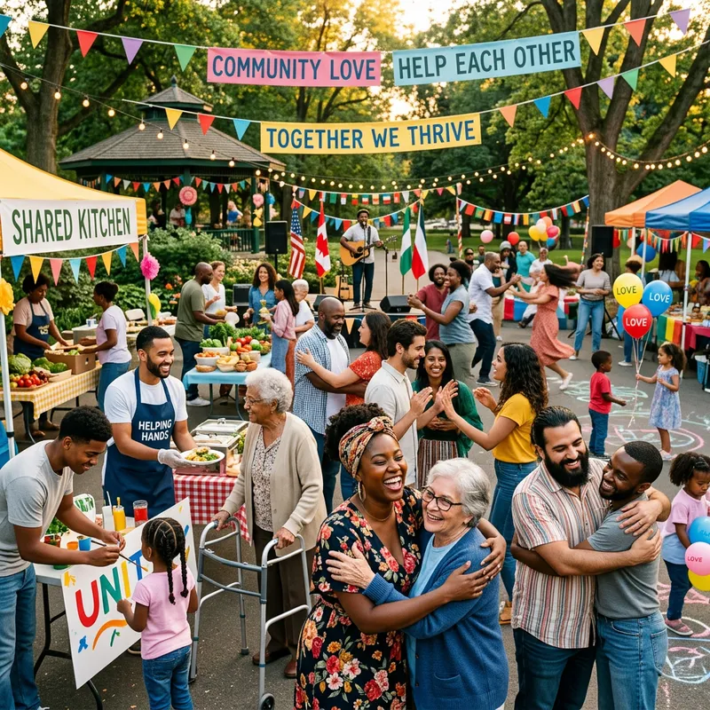 A vibrant community celebration where people are helping and loving each other