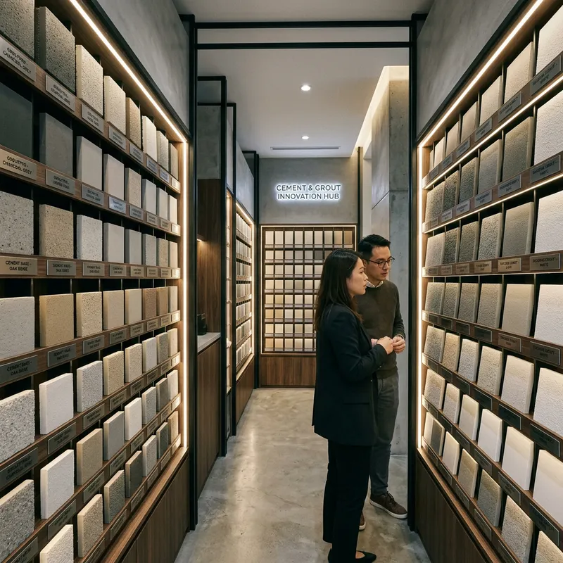 Envision a modern and compact exhibition space specifically designed for showcasing different types of cement and tile grout. The walls of this room are lined with an array of various cement and grout samples, each neatly organized and labeled for the viewer's convenience. Flickering LEDs accent the display, highlighting the unique characteristics of each product. Here, professionals and enthusiasts alike can closely observe the texture, color, and quality of each material. Echoing conceptual minimalism, the space maximizes its small size with a clever layout, creating an intimate yet comprehensive display hub for these essential construction materials.