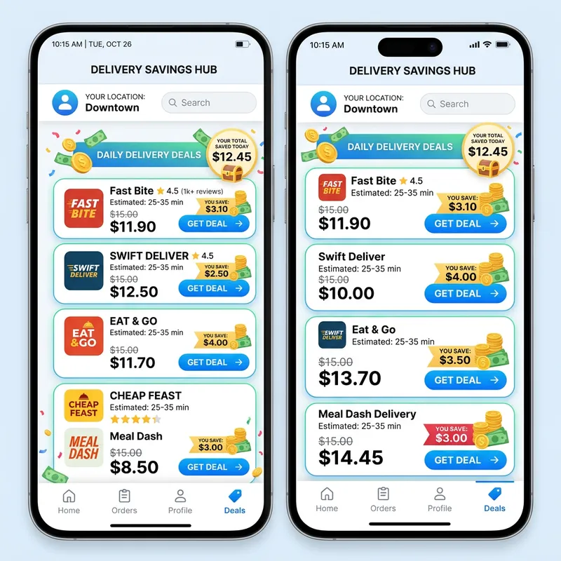 A sleek user interface screenshot showing the discounted prices of various delivery companies within a mini-app. Creative elements can include symbols like gold coins or paper money to represent the amount of money saved.