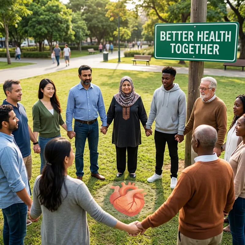 Create a compassionate visual representation illustrating support for individuals encountering health difficulties. Imagine a circle of diverse people from different descents holding hands, embodying unity and strength. The circle includes individuals like an Asian woman, a South Asian man, a Middle-Eastern senior woman, a black young adult, and a White elderly man. In the center reveals a symbol of a human heart as the epitome of care and empathy. Adjacent to the circle, there's a road sign containing the words 'Better Health Together'. This image is in response to the ten questions enumerated in a post denoting signs that signal a need for help. Such a visual can be utilized under posts to encourage people to seek support, foster a sense of community, and endorse collective progression towards improved health.