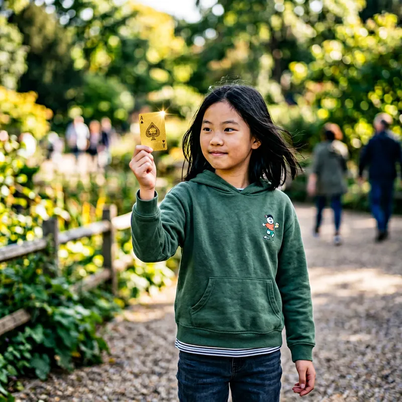 A young East Asian girl with black, shoulder-length hair, in a casual outfit, is holding a gleaming poker ace card in her right hand. She's looking at the card with an expression of victory and determination. The background is blur with hues of green, indicating a garden or park setting during the daytime. Her grip on the card is firm, highlighting her confident stance.
