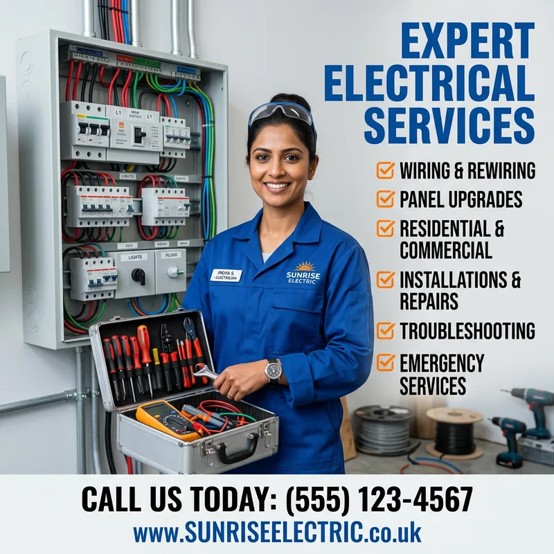 A confident South Asian female electrician holding a toolbox in front of an electrical panel. The image is designed in a minimalistic style with clean lines and vibrant colors. She maintains a friendly facial expression. The art style is that of a high-resolution camera, with emphasis on the detailing and texture to create a professional genre. Superimposed on the image are bold typographies, focusing on contact information and services provided.