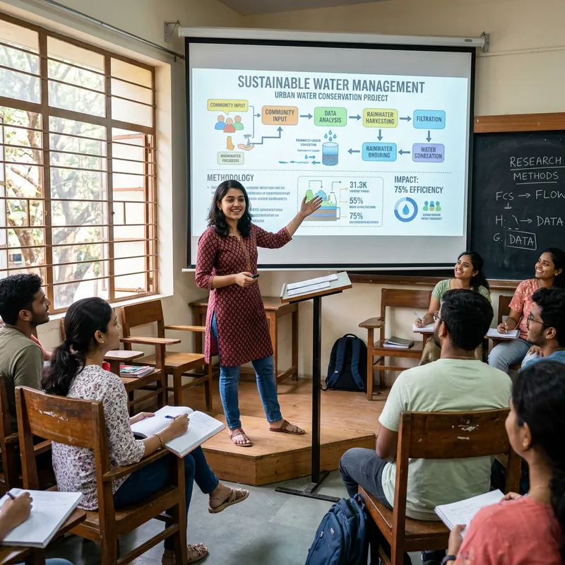A South-Asian female student stands in front of a class, passionately explaining her latest project. An elaborate visual aid, showcasing flowcharts, diagrams, and facts, is displayed on a screen behind her. The classroom setting is bustling with liveliness - classmates seated on wooden chairs, attentive and engaged, illuminated by the soft, natural light streaming in through the windows. The atmosphere is filled with curiosity, intelligence, and collaborative learning. The look in the student's eyes exudes confidence and understanding of the material, signaling well-prepared research and a zeal for knowledge.