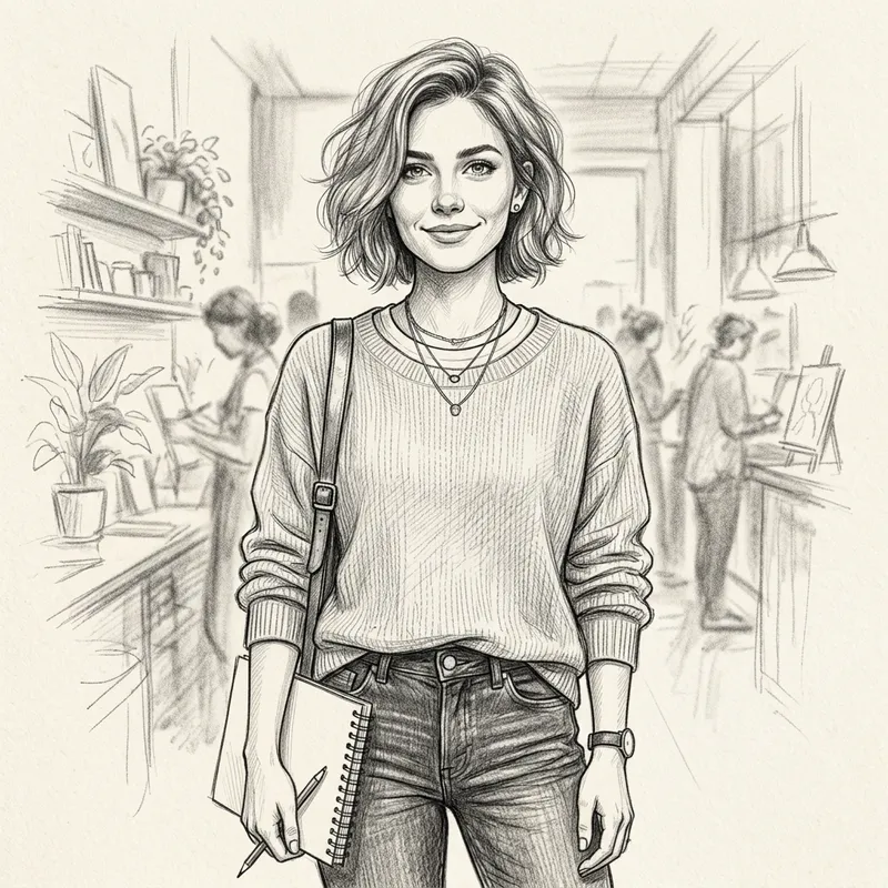 A pencil sketch of a confident, trendy young adult Caucasian woman, careful to be non-sexualized. Her eyes are sparkling with ambition, and a soft smile plays on her lips. Her hair is styled in a fashionable manner, perhaps a loose updo or a simple bob, giving away her trendy personality. She is dressed in contemporary clothes, a casual yet chic outfit that signifies her confidence. The fine details, like the texture of her hair, the shine in her eyes, and the folds of her outfit, are meticulously captured in the pencil sketch.