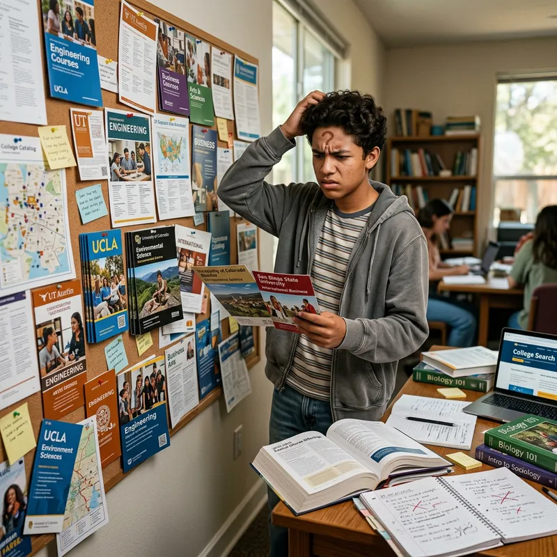 A confused Hispanic male teenager standing in front of a cork board filled with college brochures and course catalogs. He's been researching options for which field to study but hasn't come to a decision yet. He has books spread on a table nearby, and a look of confusion on his face as he hesitates between the multitude of choices. The unmistakable symbol of the question mark is visible on his brow, metaphorically representing his uncertainty and indecision.