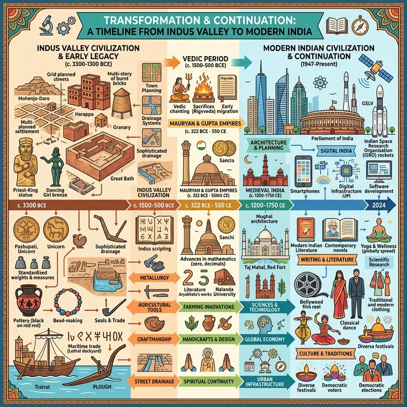 Create an illustrative timeline depicting a connection between the Indus Valley Civilization and Modern Indian Civilization. Show significant events, cultural practices, and advancements in different fields such as architecture, science, and literature. On one side of the timeline depict artifacts, settlement structures, and symbols related to the Indus Valley Civilization. On the other, show various elements of Contemporary Indian Civilization including modern architecture, literature, and technological innovations. Include a series of arrows, infographics, and annotations to represent the transformation and continuation of various aspects from ancient to modern times.