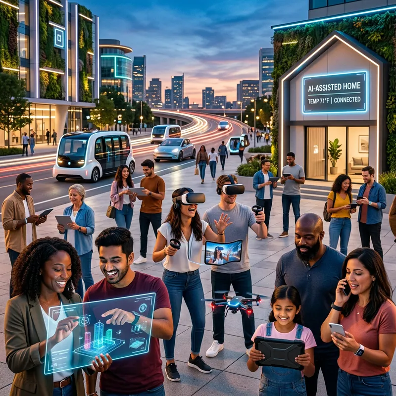 An image capturing the essence of new technologies. Show a vibrant scene with a variety of people interacting with cutting-edge gadgets and devices. Different people of varying descents such as South Asian, Hispanic, Caucasian, and Black, of different genders, could be seen using smartphones, holographic displays, virtual reality headsets, and drones. There could also be autonomous vehicles moving in the background and smart homes equipped with AI-assisted devices. The mood of the image should be optimistic, portraying technology as a powerful tool for connectivity and progress.