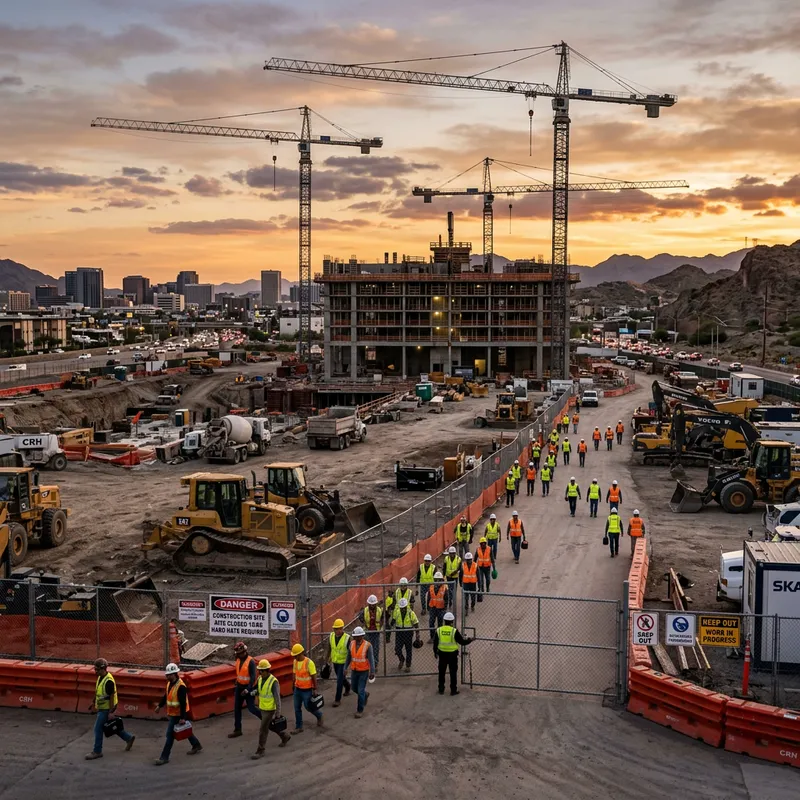 A detailed view of a large construction project site at the end of the working day indicating closure. There are various types of machinery like cranes, bulldozers, and trucks, scattered around. Construction workers in safety gear such as helmets and vests are finishing up their tasks and starting to depart the site. Safety signage and barriers are prominently displayed around the site. The sky above hints at the beginning of dusk, with warm hues indicative of the setting sun. The site is surrounded by a mix of urban infrastructure and slightly rugged terrain.
