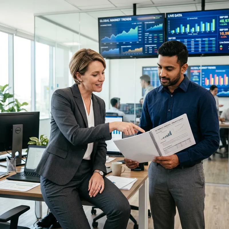 An office scenario where a female boss with Caucasian descent in a business suit is providing constructive feedback to her South-Asian male employee who is holding a report. They are in a well lit room with modern interior design, screens displaying live market trends can be seen in the background. The boss is leaning against her desk and pointing something out in the report while the employee attentively listens.