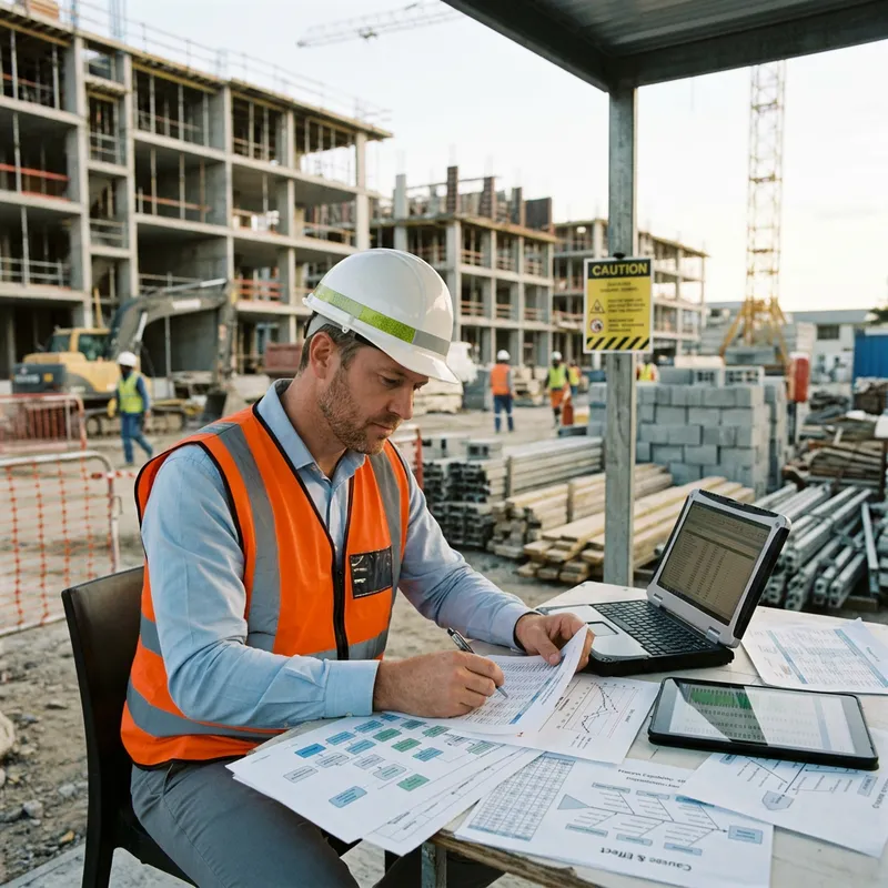 A Caucasian male consultant working on Six Sigma models. He is at a construction site where you can see various construction equipment and partially built structures around him. The consultant is focused on analyzing complex business processes, he has charts and graphs spread out before him on a makeshift desk. His safety helmet and vest indicate his location at the construction site.