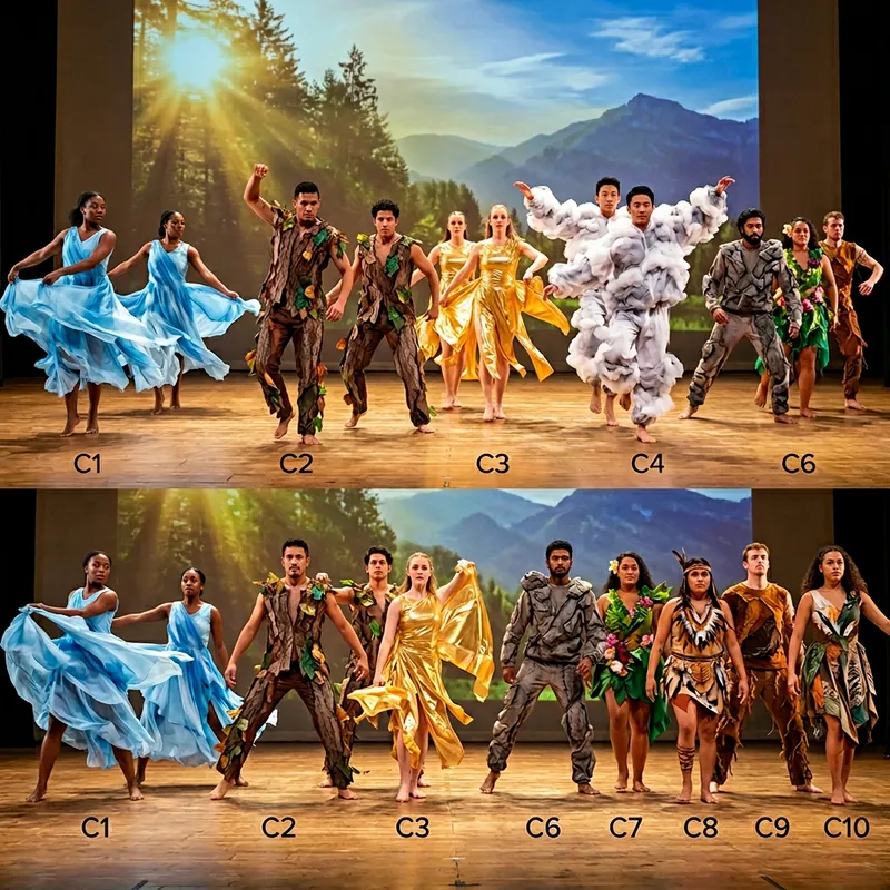 Visualize ten distinct contemporary dance costumes for an ensemble of ten individuals. Each costume should reflect the theme of healing the world. Costume 1: light blue flowing dresses that mimic the shape of water for Black female dancers. Costume 2: Outfits designed like a tree bark with leaves for Hispanic male dancers. Costume 3: Shiny gold material representing the sun for Caucasian female dancers. Costume 4: Suits resembling clouds for Asian male dancers. Costume 5: Multi-colored rainbow attire for Middle Eastern female dancers. Costumes 6 to 10: Elements of the earth - mountains, flora, and fauna depicted on the outfits for South Asian, Pacific Islander, Indigenous, White, and mixed-race dancers of different genders.