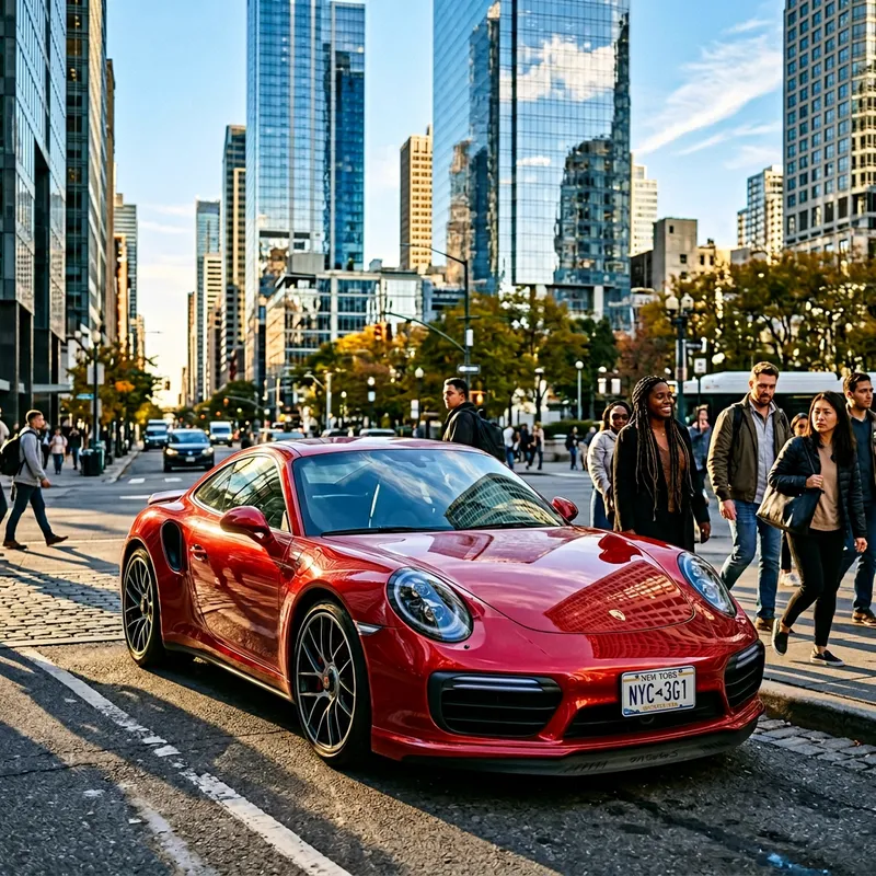 A detailed view of a sporty, contemporary car. The car is painted in a shiny, vibrant shade of red and is situated in a city environment. The sun casts long shadows, highlighting the car's smooth lines and sleek design. There are skyscrapers in the background, their glass windows gleaming under the daylight. On the car's surface, clear reflections of the surrounding architecture are distorted by its polished curves. Nearby, pedestrians of diverse descents and genders are going about their day, casting intrigued glances at the car.