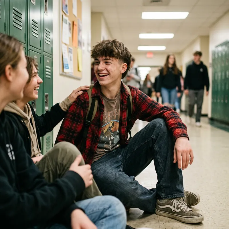 An artistic portrayal of a 15-year-old teenage boy. He should be captured in the middle of a natural pose, such as studying at a desk or laughing with friends. His expression should communicate a sense of youthfulness and adolescence. His physical appearance, including facial features, hairstyle, and clothing style, should be contemporary and reflect current teen fashion trends. Avoid depictions that seem too mature or too childlike, aiming for a balance that accurately reflects his age. Make sure the background takes into account a typical teenager's environment, like a school hallway or a park.
