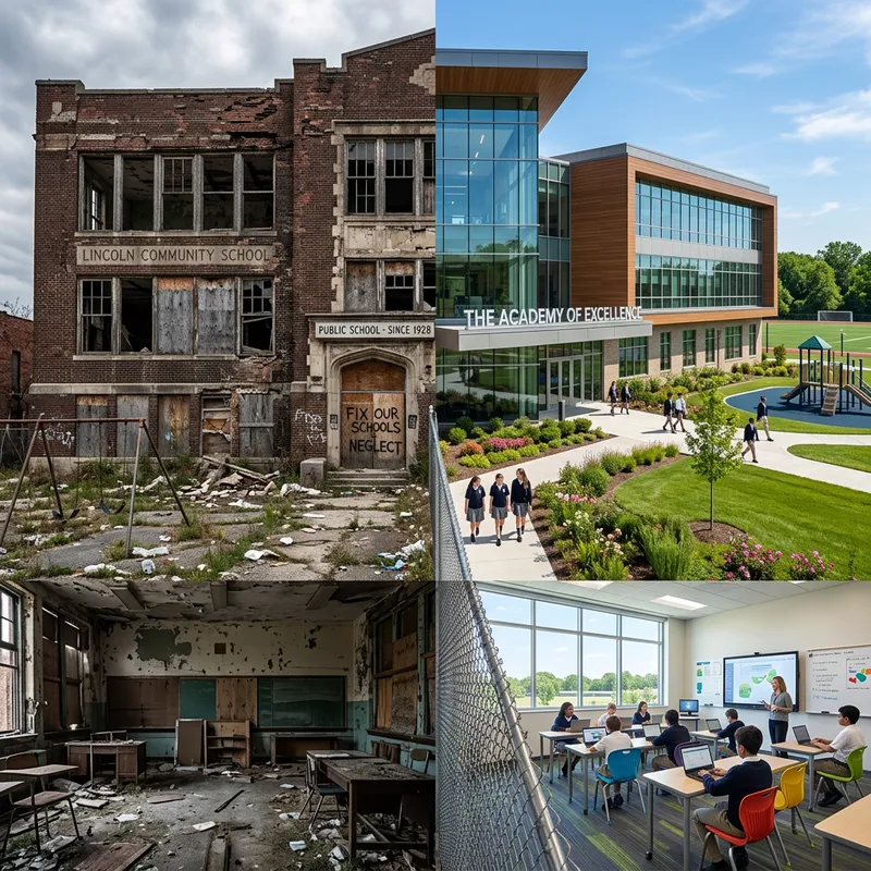 A discernible contrast between two educational institutions. On one side, there's a ruined public school with crumbling brick walls, broken windows, and dust-covered classrooms. On the other side, there's a brand-new private school complete with modern architecture, lush green lawns, sparkling windows, and state-of-the-art classroom facilities. The condition of each building speaks volumes about the disparity in resources between the two types of institutions.