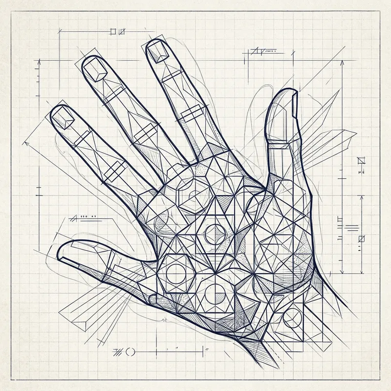A sketch or illustration of a hand has been transformed into a geometric figure. The finger outlines are represented by streamlined, straight lines forming rectangles, squares, or trapezoids, while the palm is represented as an intricate blend of geometric shapes such as circles, triangles, and hexagons. This creates a visually striking scene that combines the fluidity of organic shapes with the precision and symmetry of geometric design.