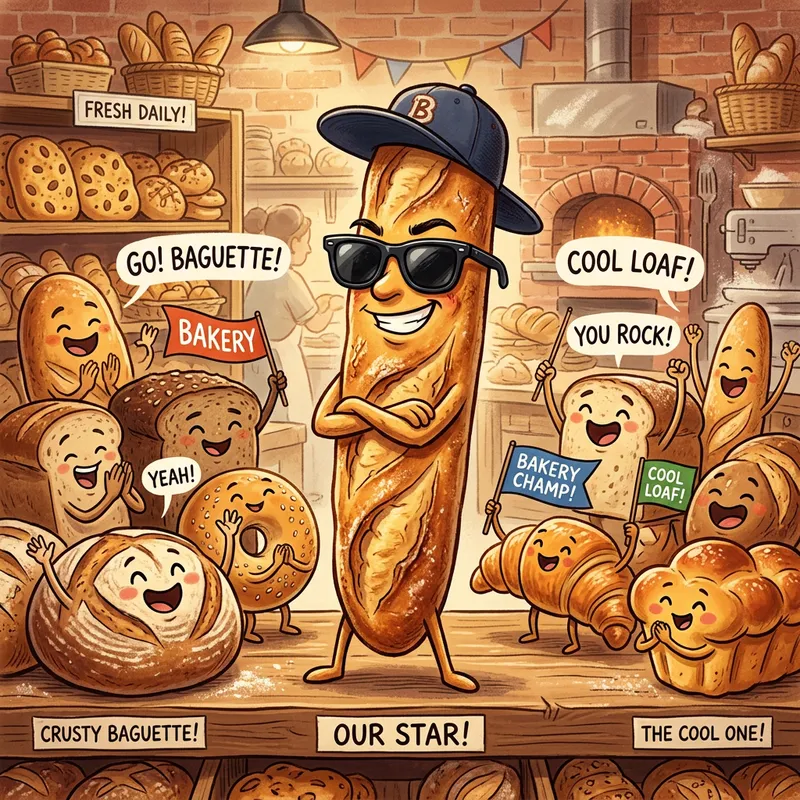 Caricature of a cool baguette bread wearing 50's-style sunglasses and a backwards cap. The baguette has a cheeky grin, standing upright with crossed arms. It's located in a bakery environment, surrounded by other types of bread cheerfully cheering it on.