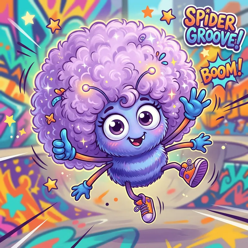 cool spider mascot with an afro of light purple fur, oversized expressive eyes, and tiny hands and feet, illustrated in a vibrant cartoon style, exuding an energetic pose with a playful expression, digital painting with bold colors and smooth gradients, whimsical character design.