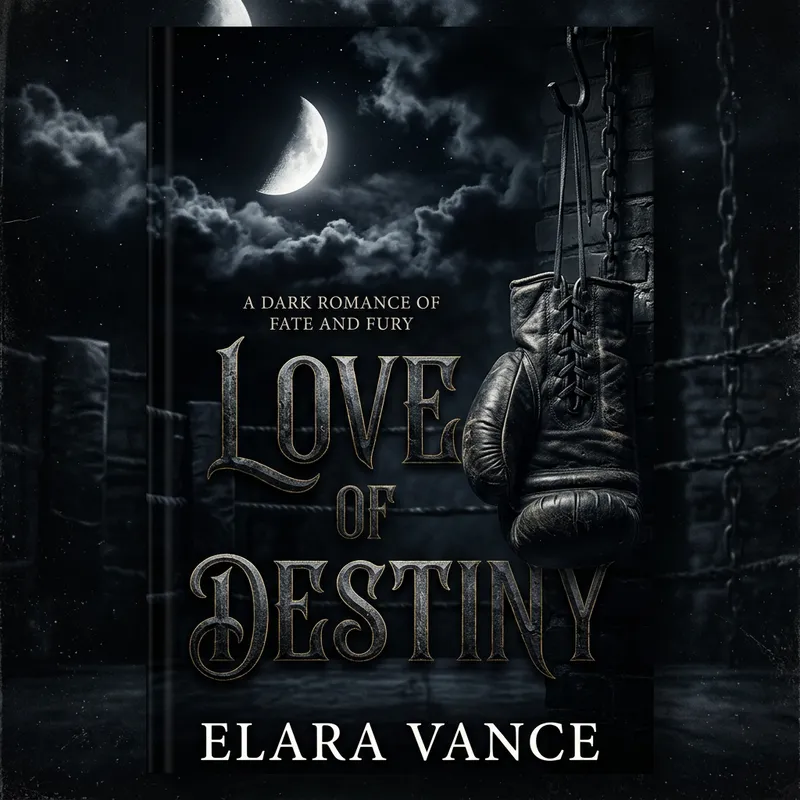 Cover of a dark romance called 'Love of Destiny'. The cover has shades of black. It features a half moon and a boxing glove.