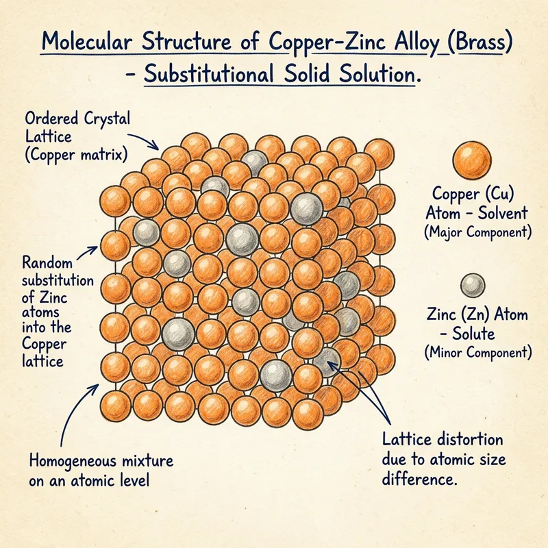 Hand-drawn diagram showing the structure of an alloy, with copper being the major component (solute/solvent) and zinc being the minor component (solute/solvent). This visual representation shows how the elements are intermingled on a molecular level, representing an aesthetically accurate and informationally detailed image of the copper-zinc interaction in the alloy formation.