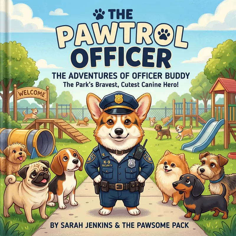 Create an image featuring a book cover that displays a Corgi dressed in a security outfit, complete with a uniform, badge, and officer's cap. This delightful canine takes center stage, standing tall and proud. The background is a well-maintained dog playground, with a variety of play apparatus designed just for dogs, all under a clear, sunny sky. Watching in admiration are other small dogs of a mix of breeds, each showcasing their cuteness. Their expressions range from awe to intrigue as they all look at the costumed Corgi with utmost admiration.