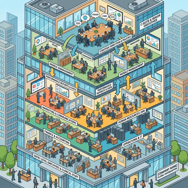 Illustration showcasing the various departments and chains of command in a large corporation. The image could show a large building with various levels. Each level has different workspaces such as a marketing department, human resources, finance, and operational teams. There are also abstract representations for the CEO and other senior executives at the top, middle managers in the middle levels, and clerical staff and employees at the bottom levels. This image can effectively demonstrate the hierarchy and flow of information in a major corporation.