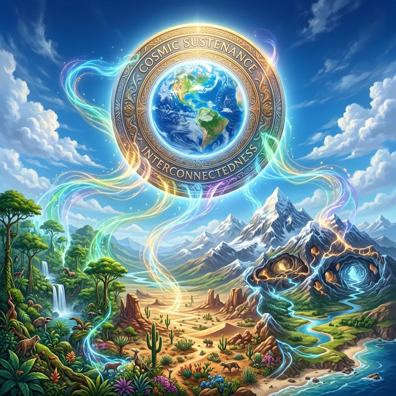 Visualize a colossal coin bearing the image of a planet, hovering gently in the azure sky. Rooted from this celestial currency, streams of ethereal energy flow out, cascading to various corners of the ecosystem beneath it. Thick, verdant forests flush with biodiversity, a sprawling desert with resilient flora and fauna, towering mountains and intricate caves, all thriving under this cosmic sustenance. Watch how this gigantic coin, with the planet's imprint, nurtures and sustains the ecosystem, demonstrating an interconnectedness between the cosmos and Earth's various biomes.