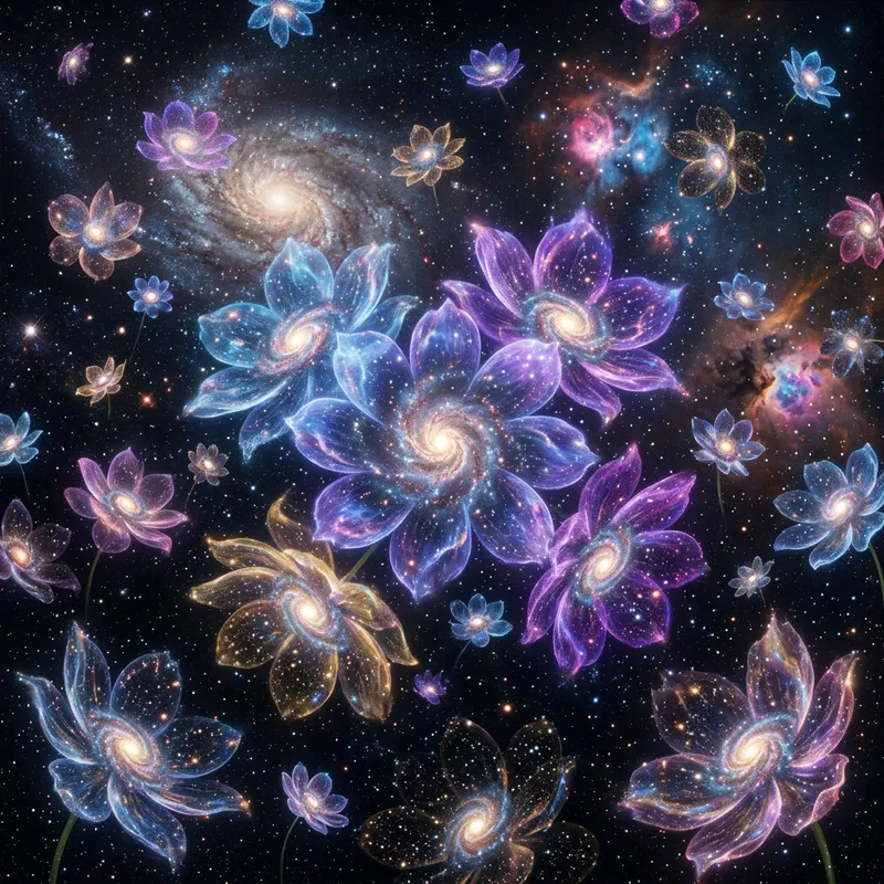 Imagine an ethereal scene of cosmic flowers. These aren't your traditional flowers but instead, they are made of glowing stardust, nebulas, and galaxies. Their petals emanate soft radiance in resplendent hues of cosmic spectacle, blues, purples, and star-filled blacks. Amidst the inky blackness of space, these celestial blooms float suspended, swaying gently as if in a cosmic breeze. The center of each flower is akin to a swirling galaxy, teeming with star-clusters. The view is panoramic, presenting an otherworldly botanical garden amidst the serene and boundless expanse of the cosmos.