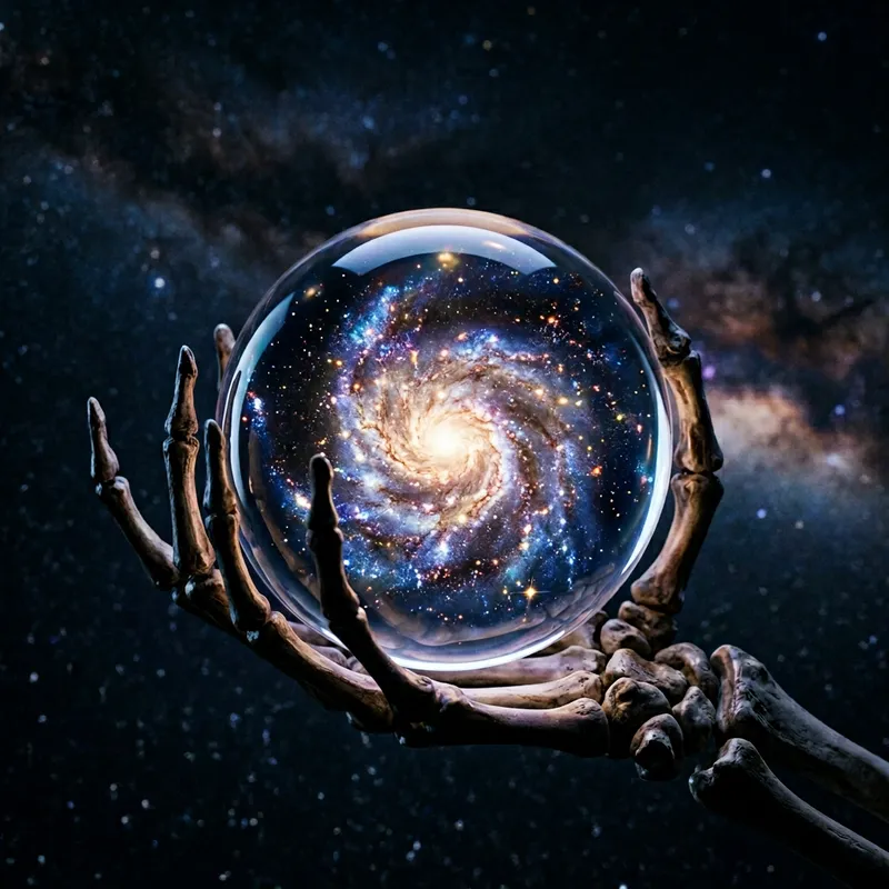 A bony hand of a skeleton is gently clasping a transparent glass orb. Within the curvature of the gleaming sphere, a miniature galaxy twirls and glows. The cosmic constellation within it is a breathtaking sight, replete with countless stars, nebulas and astral bodies, swirling in a mesmerizing dance of colors and shapes.