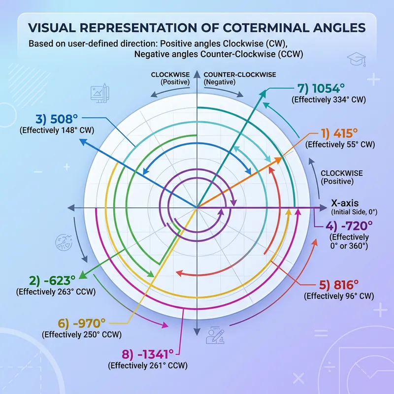 Visual representation of the following coterminal angles: 1) 415 degrees, 2) -623 degrees, 3) 508 degrees, 4) -720 degrees, 5) 816 degrees, 6) -970 degrees, 7) 1054 degrees, 8) -1341 degrees. The image should depict these angles on an angle wheel, where each angle is distinctly marked and labeled. The positive angles should be marked in a clockwise direction and the negative angles in a counterclockwise direction.