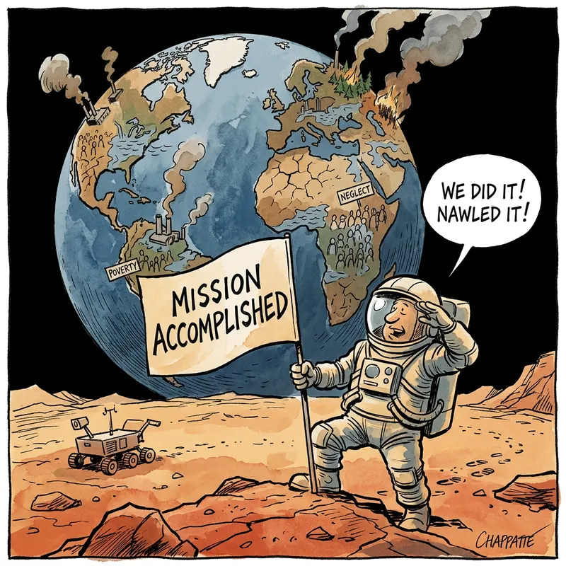 Hello, can you generate an image in a cartoon style like Patrick Chappatte that illustrates 'astronaut planting a flag on Mars 'Mission Accomplished', while in the background, we see space with Earth suffering from poverty, climate disasters, and neglect.