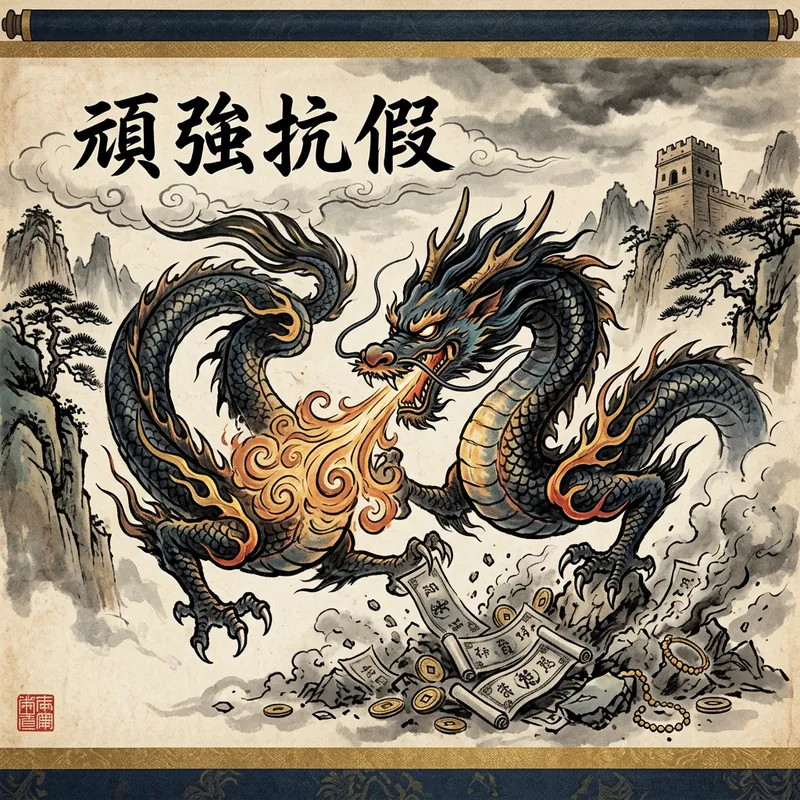 A resilient resistance to counterfeiting, portrayed in a traditional Chinese style.