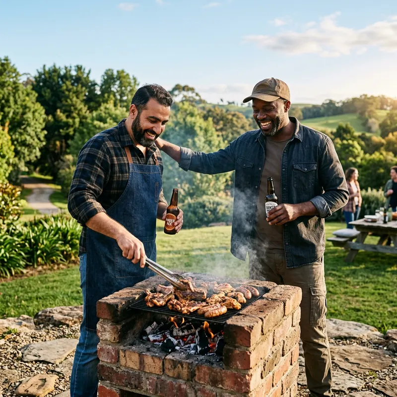 A Middle-Eastern man and a Black man, both dressed in typical country attire, are gathered around a rustic brick BBQ pit situated in the great outdoors. They are engrossed in grilling succulent pieces of meat on the fiery pit while their hand holds cold beer bottles. The aroma of BBQ is wafting through the air. Their cheerful disposition and camaraderie are indicative of a relaxed and joyful atmosphere. The background is blessed with rich greenery interspersed with a clear blue sky that's hinting at the setting sun, providing a picturesque backdrop to this jovial grilling session.