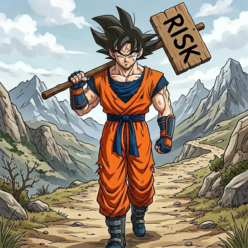 A muscled, spiky-haired anime-style character, with a bright orange gi, carries a sign labelled 'risk'. He has determined eyes, suggesting that he is ready for any challenge he might confront. The character is not Goku but resembles a familiar figure often seen in popular Japanese anime.