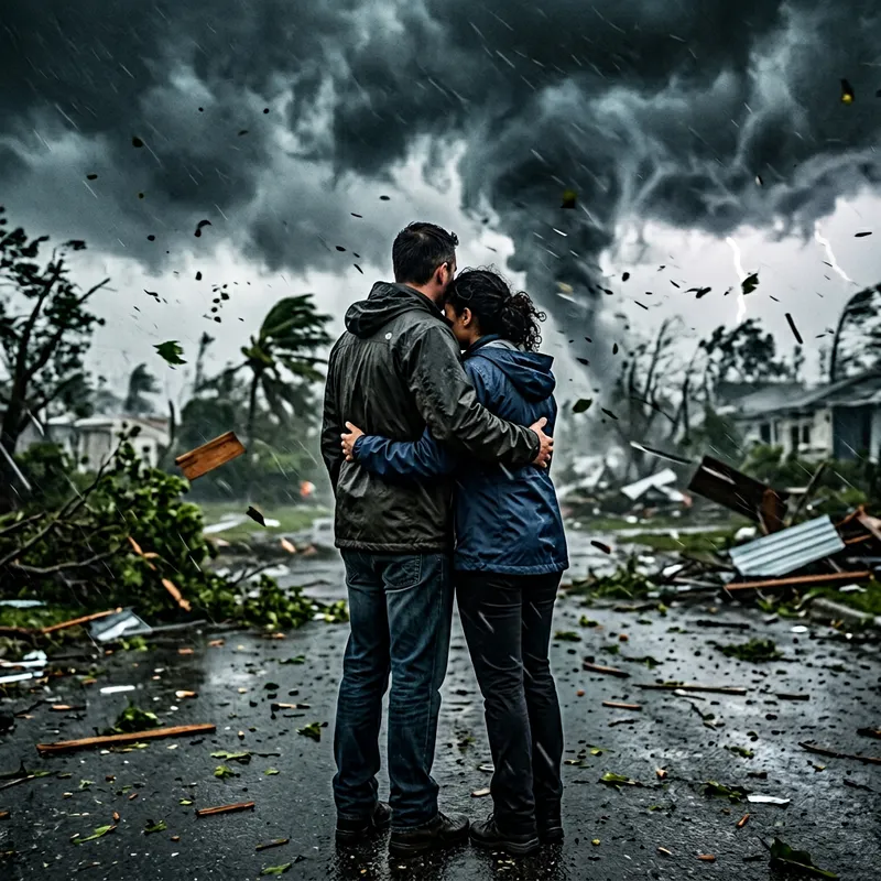A Caucasian man is embracing a Hispanic woman from behind, captured in a rear view. Their faces are turned away from the viewer, showing their connected silhouette against the chaotic backdrop. They are standing in the epicenter of a hurricane, demonstrating a defiant tone against nature's temperament. The sky is a maelstrom of swirling clouds, and debris is flying around them, yet they remain steadfast, an island of calm in the roaring tempest. The overall mood is one of courage, resilience, and enduring love in the face of adversity.