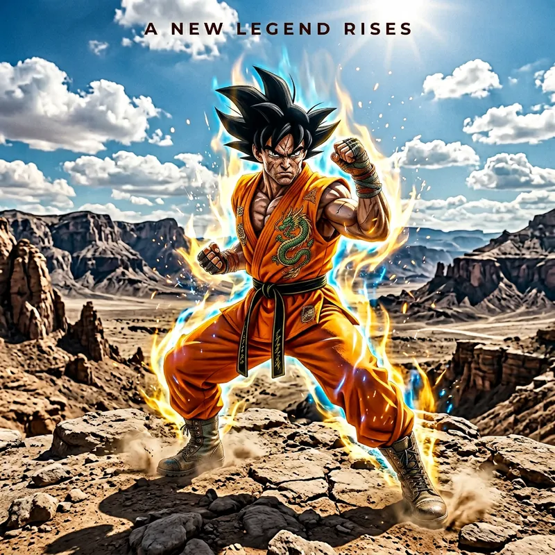 Imagine a martial arts expert with spiky black hair, dressed in bright orange martial arts attire. His eyes are intense with determination and he is athletic looking. He is striking a combat-ready stance with an aura of energy radiating from him. The background is an expansive, desolate landscape with rocky terrain, under a blue sky scattered with the occasional fluffy cloud. This character embodies courage, tenacity and selfless heroism.