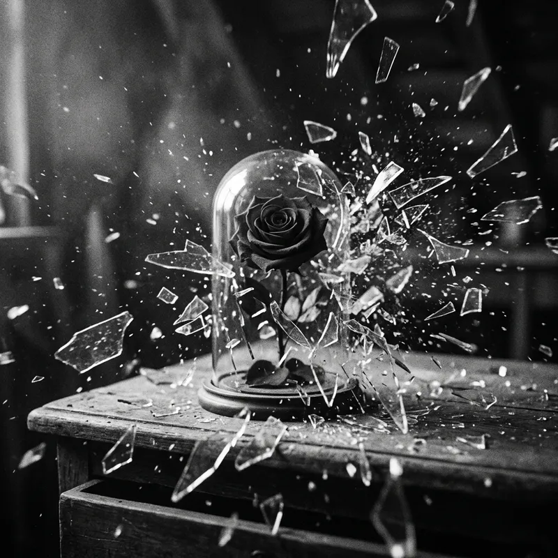 Album cover of eternal rose under a bell jar, broken in black and white with shards of glass bursting in a dark, dusty environment; the rose under the bell jar is in the background.