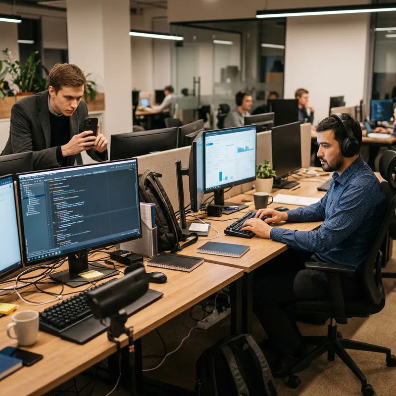 A scene showing a lithe individual of Eastern European descent, possibly named Yarik, engaged in the act of covertly taking some organized lines of code from a computer screen. Meanwhile, another individual, a man of Central Asian, specifically Uzbek, descent, is shown in the room, unaware of the ongoing surreptitious act. Both are dressed professionally, with the former individual hushed and agile, and the latter focused on his work.