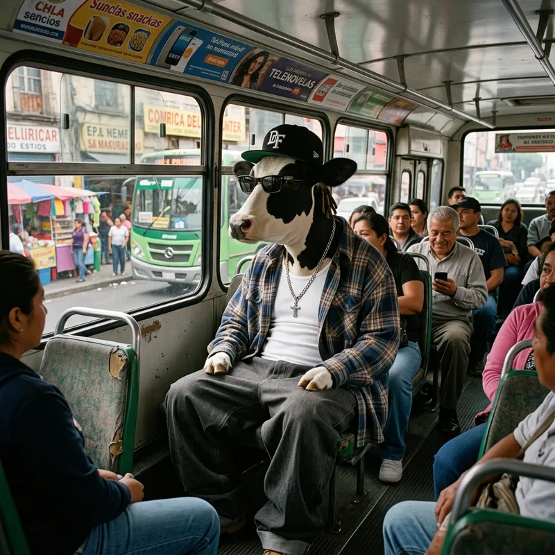 A cow wearing baggy pants, associated with Hispanic 'cholo' culture, a cap, and sunglasses, riding on a Mexico City bus.