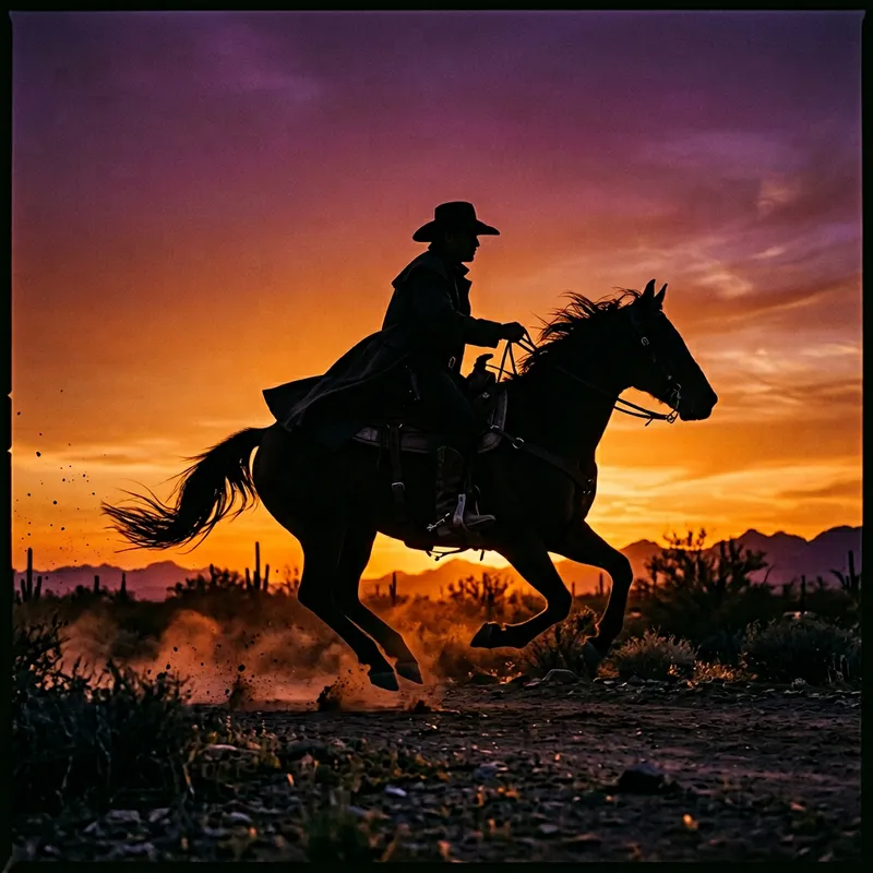 Create an image of the silhouette of a cowboy, of undefined descent and gender, riding a horse. The cowboy is dressed in traditional gear—the distinctive wide-brimmed hat, a long coat, and boot with spurs. The horse is mid-gallop, projecting the motion and vitality associated with this iconic scene of the American Old West. The background is a stunning gradient sunset, with colors that gradually shift from vibrant orange to deep purple as they reach the skyline. The entire image is perfectly contained within a square frame, emphasizing the focus on the cowboy and his horse.