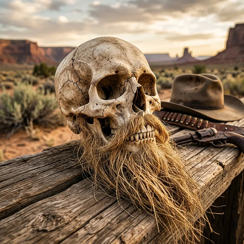 Long gone are the days of the Wild West but the spirit of those times can still be found in symbolic visuals. I want you to imagine the skull of a long-deceased cowboy. The skull is tanned as if it has been bleached by the relentless southwestern sun. It has broad cavities where once sparkling eyes used to be, and a smirk that tells tales of past adventures. Still clinging to the chin of the skull is a long, flowing beard the color of dried straw. The beard is robust and well-kept, a testament to the cowboy's ruggedness and personality even in the afterlife.
