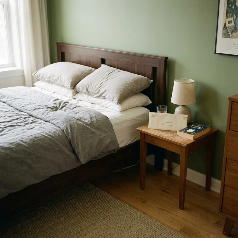 Cozy Bedroom Setup with Envelope on Nightstand