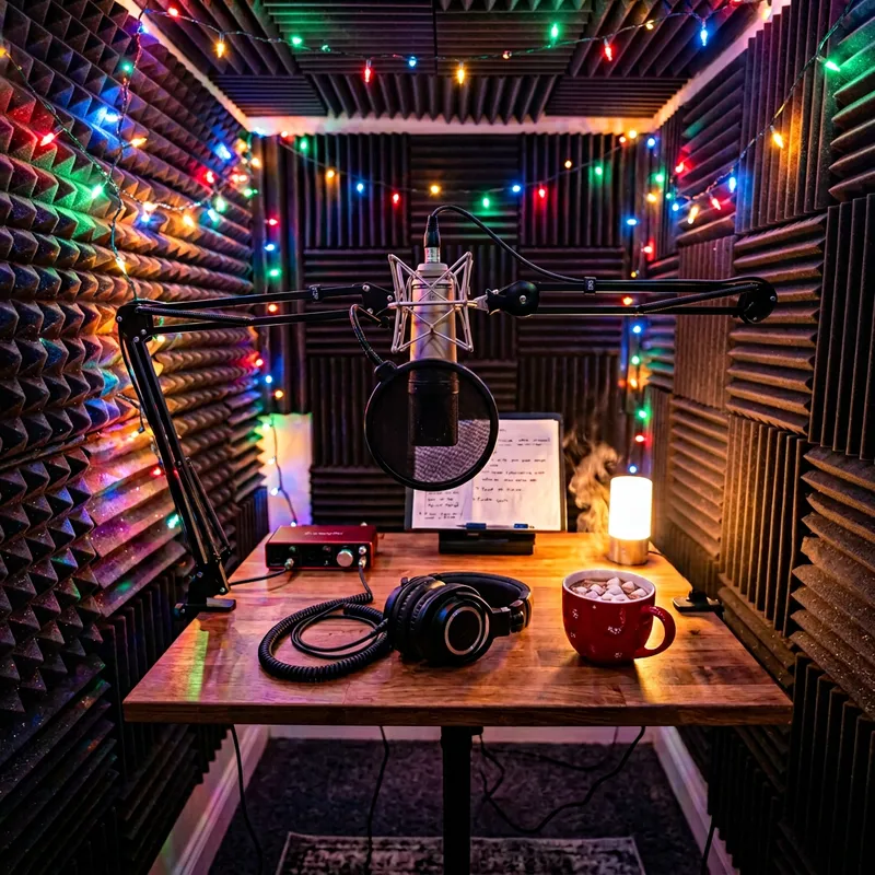 A cozy voiceover booth bathed in warm, twinkling light. Inside, there is a high-quality microphone mounted on a stand, equipped with a pop filter. Recording headphones rest beside the microphone, waiting to be used. The room is panelled with high-grade soundproof foam to enhance audio quality. A mug of steaming hot chocolate rests on a small table within arm's reach. As a festive touch, colourful Christmas lights are strung across the ceiling, casting a cheerful glow throughout the booth, painting an intimate picture of a serene holiday working space. The lights' reflections can be spotted on the glossy surfaces, while their colors appear as soft patches on the foam surfaces. The room encapsulates the peaceful allure of Christmas fused with the productivity of a voiceover booth.