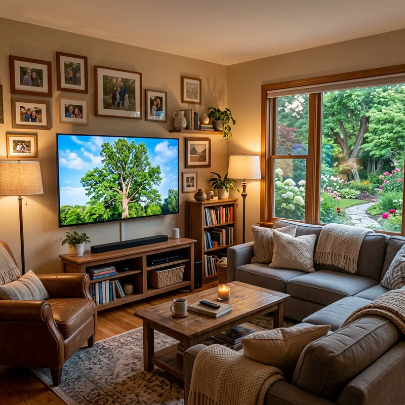 Imagine a cozy home interior with a large, flat-screen TV mounted on a wall in the living room. The TV is tuned to a peaceful nature documentary showing a tall, robust tree with green leaves under a clear blue sky. The room itself has comfy couches and armchairs arranged in front of the television, with soft, warm lighting illuminating the space. Family photos and various pieces of tasteful decor adorn the walls, creating a feeling of familial warmth and welcome. As a contrast to the technologically advanced television, a large window allows a view outside to a real-life lush garden with trees and flowers.