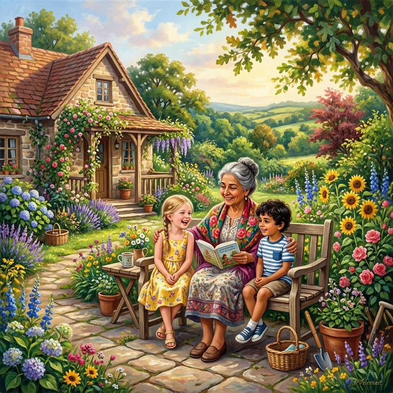 Conjure an inviting scenery, presenting a cozy homestead embedded within a flourishing verdant panorama. Portray a heartwarming scene of a grandmother of Hispanic descent spending time with her grandchildren, one of Caucasian descent and the other of Middle-Eastern descent, in a tranquil backyard. Render the image using acrylic paint-like aesthetics with luminous, effervescent colors, delicate brushwork, and warm lighting, emanating a familial and welcoming aura. The style should be conventional, resembling traditional acrylic painting techniques.