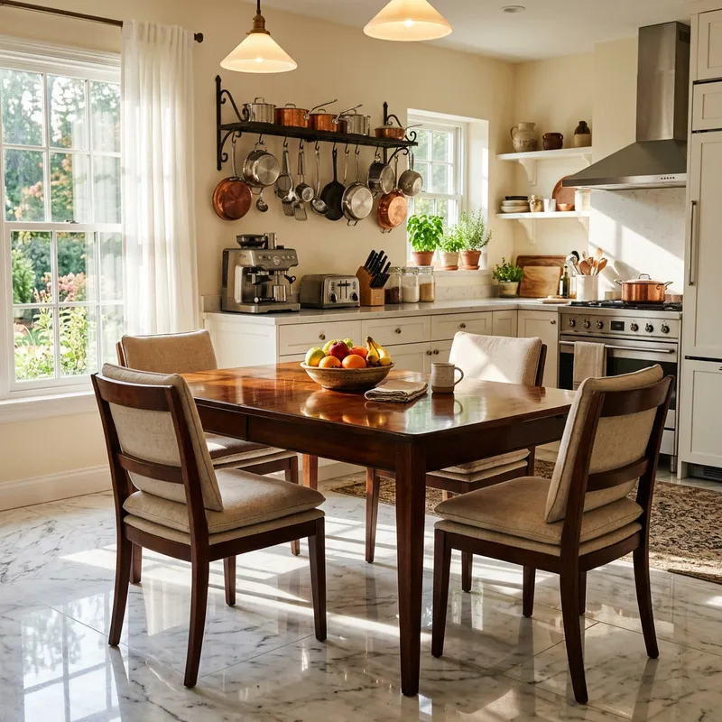 Imagine a kitchen interior. The floors are a shiny marble, reflecting the morning sun streaming in through a window decorated with gauzy white curtains. At the front of this kitchen stands a wood table, rich and ancient, lovingly polished until it reflects the overhead lights. Surrounding the table are comfortable chairs with matching wooden frames and plush upholstered cushions. On the table rests a bowl of fresh fruit, a testament to the lively atmosphere this kitchen present. The walls are adorned with racks holding gleaming pots and pans, while an array of kitchen appliances rest on the countertops. It's a sanctuary for anyone who finds joy in cooking.