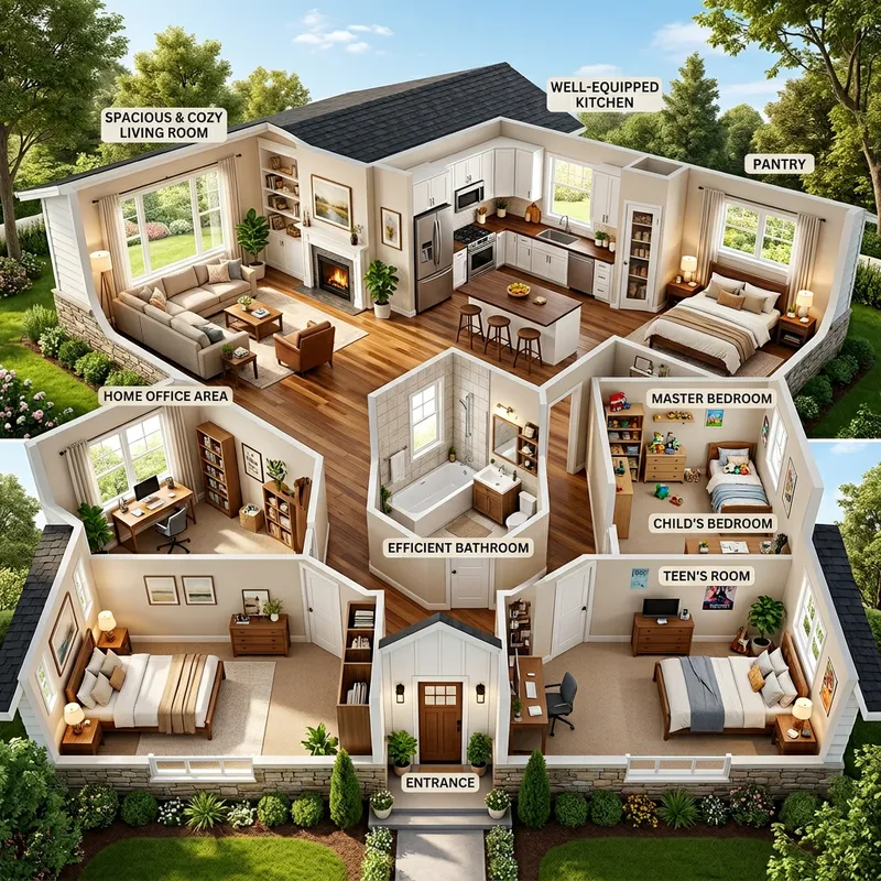 Visualize a cozy one-story residential house design. The architectural style is simple yet elegant. Within this house, you'll find a spacious and inviting living room, a well-equipped kitchen with modern appliances and ample storage spaces, four comfortable bedrooms suitable for a family with varying tastes, and a single, efficient bathroom designed for practicality. Each room should be distinct and fitted with appropriate furniture. Additionally, incorporate natural light solutions for a warm and welcoming atmosphere.