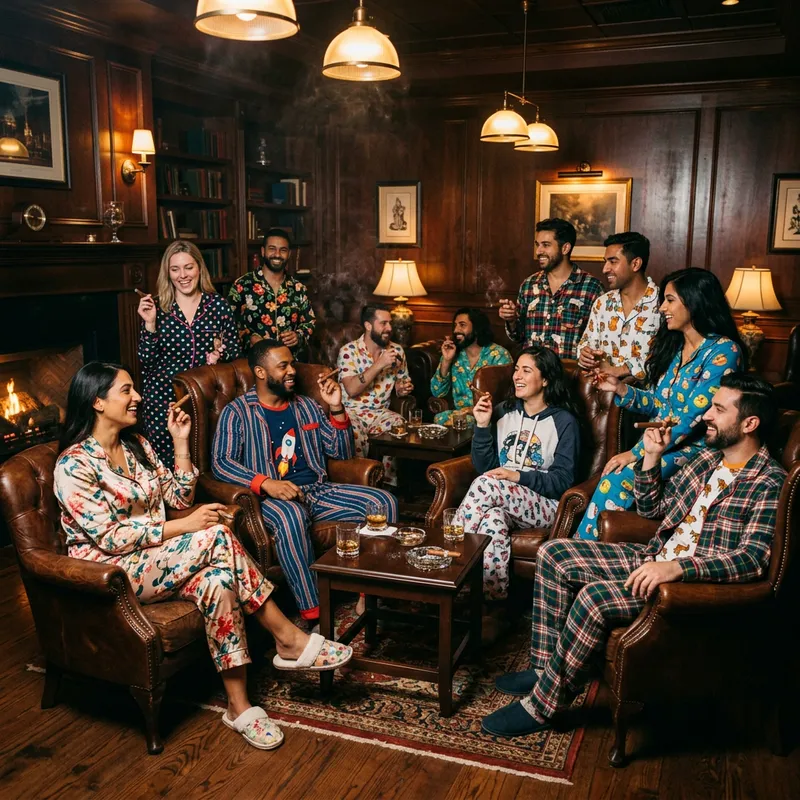Cozy Pajama Gathering in Sophisticated Cigar Lounge