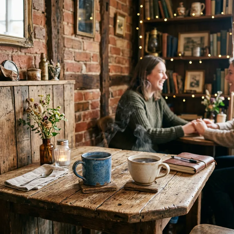 A photo that captures a scene set in a cozy, rustic environment. On a wobbly wooden table, two hot coffee cups emit a fragrant aroma that sees steam rise delicately to mingle with the cool air. Warm lighting casts soft shadows around, enhancing the sense of comfort. Old, weathered bricks and reclaimed wood add a charmed antiquity to the background, while various vintage trinkets are arranged haphazardly across the space, contributing to the atmosphere's rustic allure. Overall, the scene invites one to slow down, to nestle into the comfort of good company, and enjoy heartfelt conversations over fresh coffee.