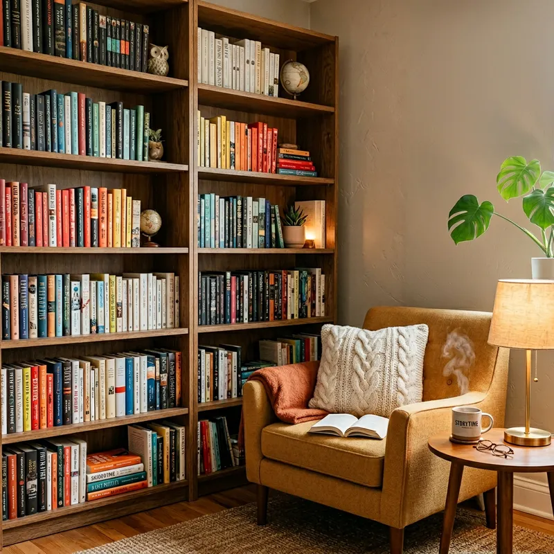 Create a cozy, welcoming wallpaper for a story reading application on mobile phones. The central focus should be a visually inviting woody bookshelf filled with colorfully covered books. A warm, softly lit reading nook with a comfortable armchair and a fluffy pillow should be in the corner. A hot cup of tea steaming on a side table adds a sense of comfort. The design should be balanced, neither too minimalistic nor too cluttered, to avoid distraction from the application's main focus of reading. A markedly modern aesthetic with warm, neutral colors would suit the overall ambiance.